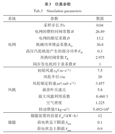 为验证所提的风储联合系统参与电网一次调频的改进控制策略的可行性和有效性,使用含有风机和储能装置系统作为研究对象,在Matlab/Simulink 中进行效果验证。总仿真时长设置为200 s,相关的参数如表3所示。