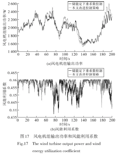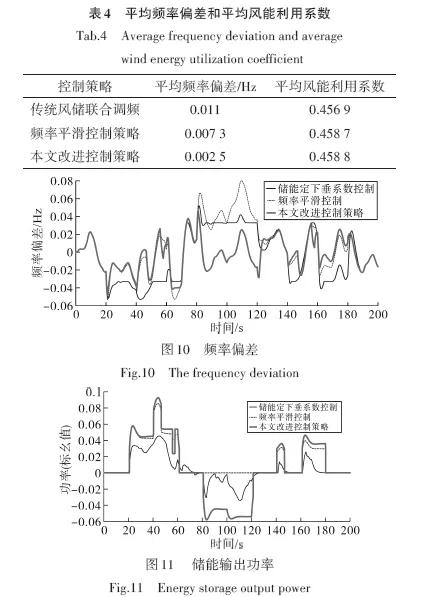 从图10可以看出,在风速和负荷同时随机波动的情况下,传统储能定下垂系数控制策略的频率偏差最大波动范围为-0.053~0.052 Hz;而采用所提出的改进控制策略下的频率偏差的最大波动范围为-0.048~0.047 Hz;从表4可以看出,本文所提改进控制策略的频率偏差平均值最小,仅有0.002 5 Hz,并且风能利用系数平均值最大,为0.458 8。