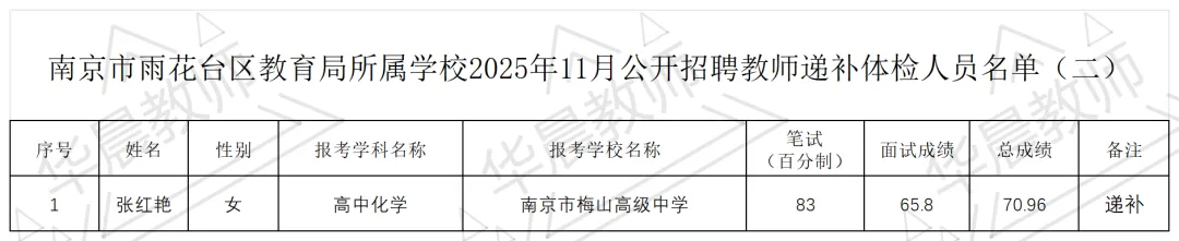 根据《南京市教育系统部分事业单位2025年11月公开招聘教师公告》(宁事招公告(R)﹝2025﹞22号),现将递补体检人员名单(二)公示。对公示名单如有异议,请与南京市雨花台区教育局联系,联系电话025-52883593。