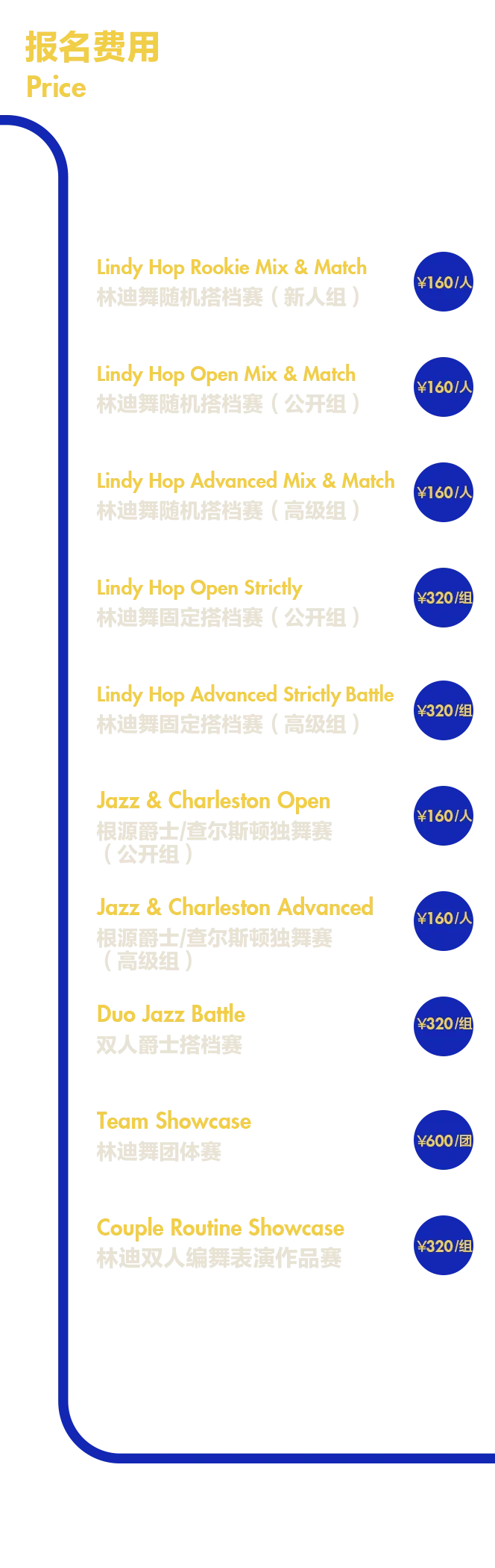 单人报名;该项目与Jazz & Charleston Open不可同时报名。