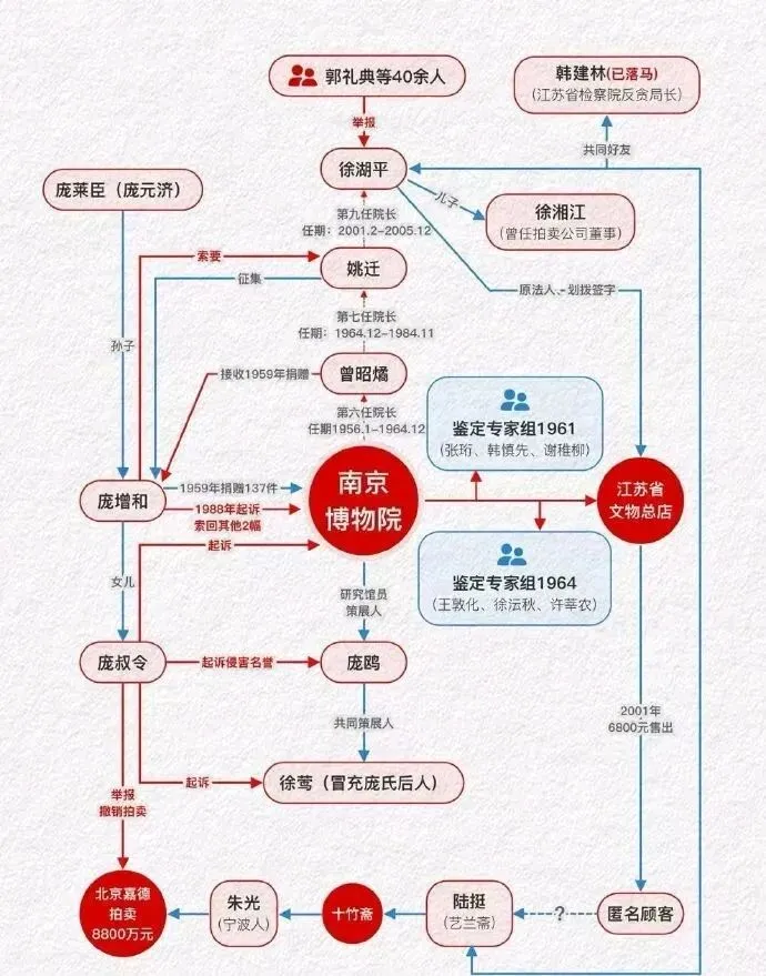 - 2025年6-7月:庞叔令核验捐赠品,发现5件下落不明;南博书面答复称5件为伪作已被剔除并划拨,但未提供去向材料 。
