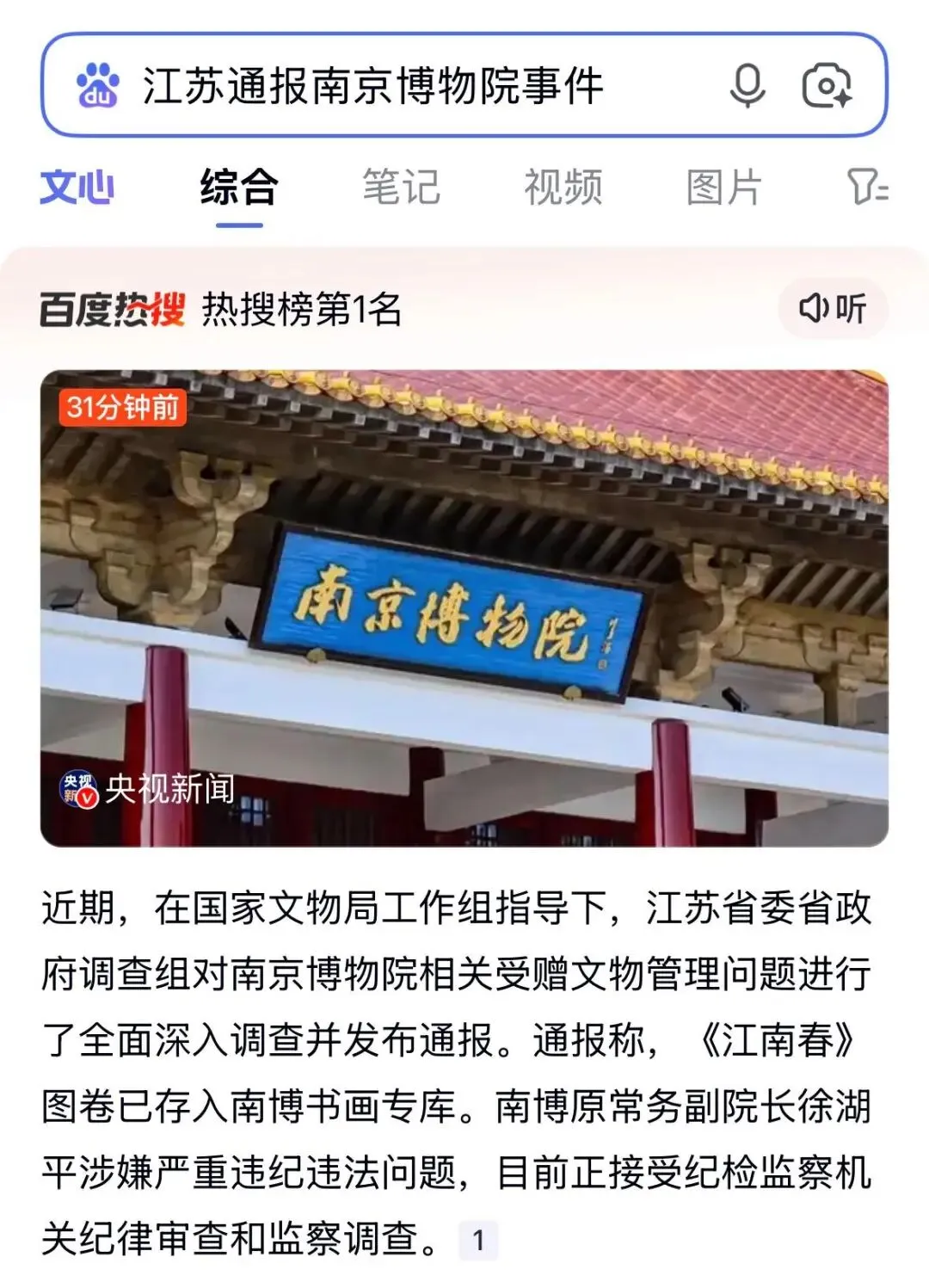 南京博物院原常务副院长徐湖平被查,24人被处理,《江南春》图卷终于回到了南博的书画专库。这看似是一个"文物回家"的圆满结局,但读完通报全文,我心里堵得慌。