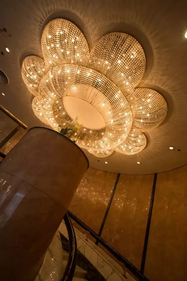 豪华的施华洛世奇水晶吊灯是大厅的亮点,最漂亮的一盏吊灯在通往二楼的楼梯口,花瓣状的吊灯散发着迷幻的光彩。