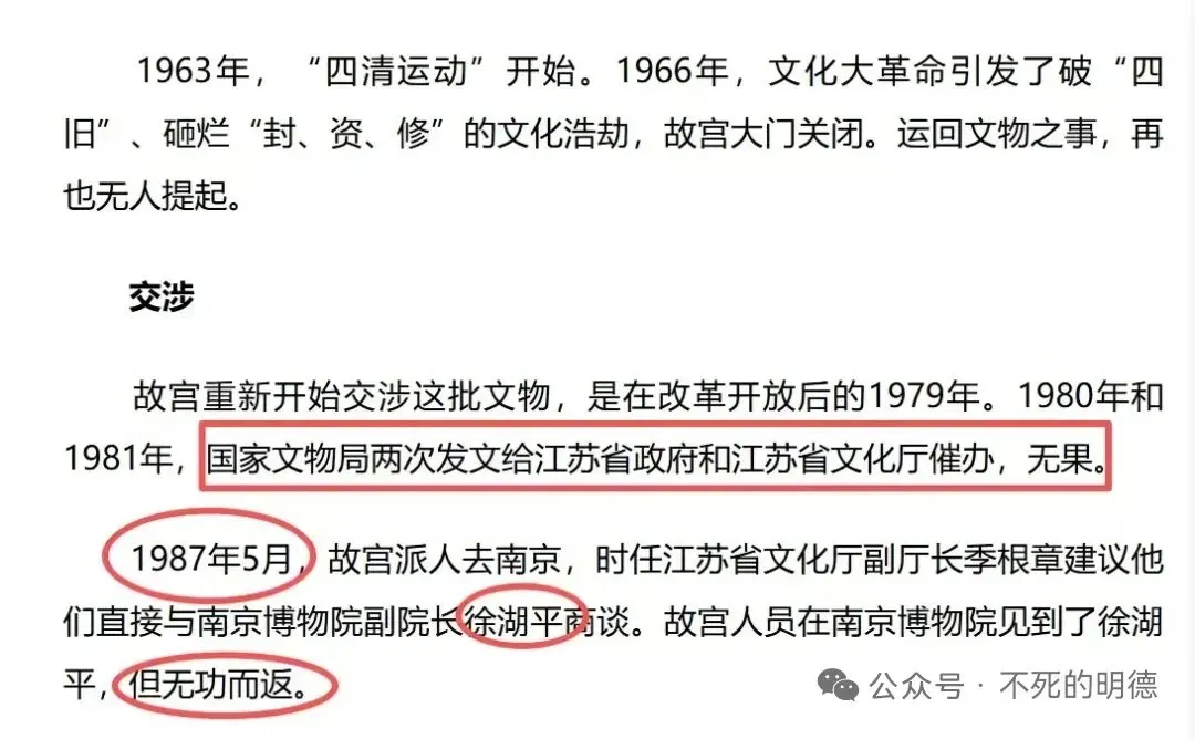 在南京博物院存放着一批南迁文物,故宫博物院曾经花费了大量的时间(跨越数十年)和精力,请求对存放于南京博物院的南迁文物进行清点,但屡屡被拒绝、敷衍、搪塞,拖到最后竟是不了了之。