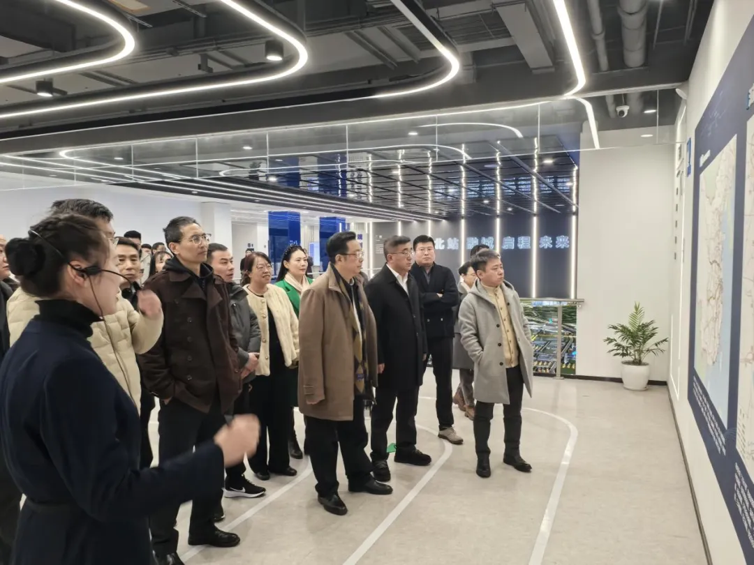 座谈会前,与会人员共同参观了江北新区枢纽办展厅,学习了解了北站项目规划理念、发展定位以及核心功能区、交通枢纽、产业布局、配套设施等设计亮点与优势。