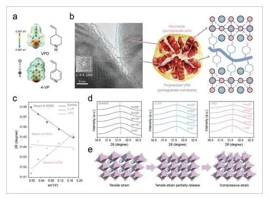 金属卤化物钙钛矿太阳能电池(PSCs)将高效率与低成本加工相结合,但其商业化受到残余拉伸应变和缺陷驱动不稳定性的阻碍。在甲脒基FAPbI3钙钛矿中,热膨胀失配放大了晶格应力,加速了缺陷形成和非辐射复合。近日,南京工业大学王芳芳、李仁志、中山大学袁艺报道了一种动态应力调节分子添加剂,4-乙烯基哌啶(VPD),它将强路易斯碱性与可聚合乙烯基结合在一起。