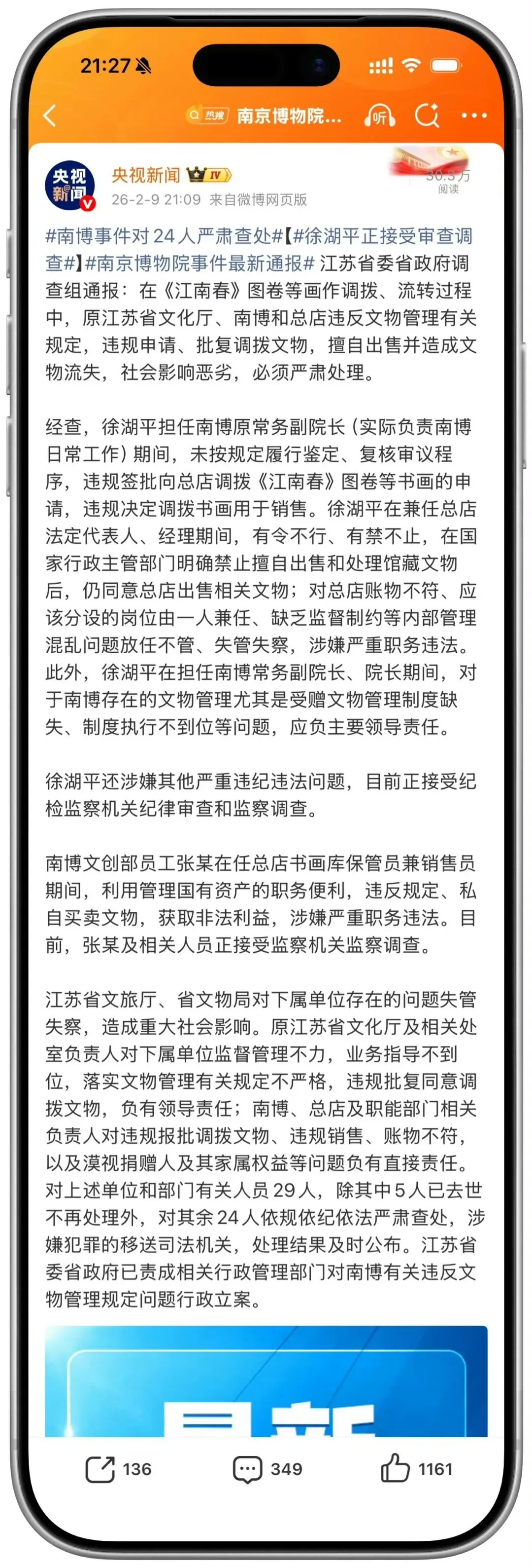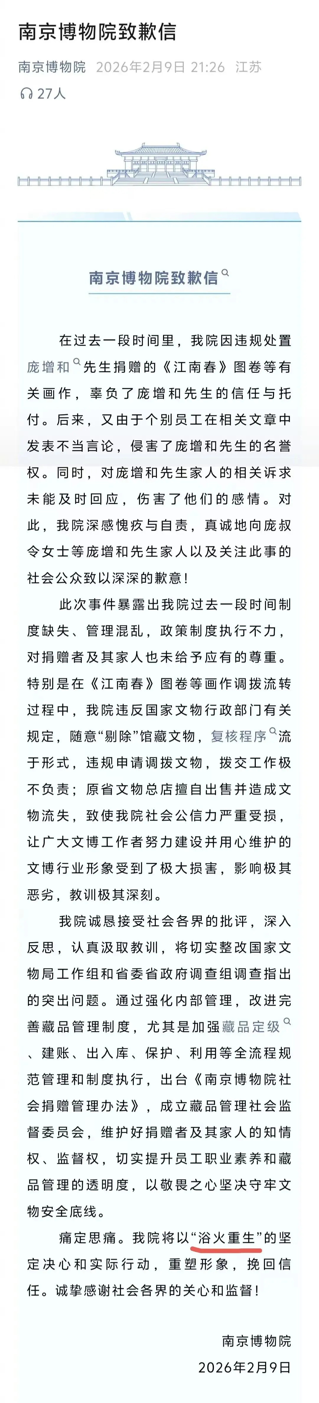 今天看到南京博物院监守自盗的后续结果,果然存在监守自盗的情况。在1990年代徐湖平违规签批,将5幅画作调拨至省文物总店销售;原省文化厅未严格审核即批复同意,违反文物管理规定。其中有29名责任人,但因5人死了,另外24人被依规查处,移送司法机关。还追回了4幅画,包括那幅《江南春》。也算给捐赠者家属一个说法。《江南春》的盗取细节是,书画管理员兼销售员张某利用职务之便,将《江南春》的图卷标价从25000改为2500,并且还打了个九折,以2250低价卖出,转手倒卖就赚12万,这是在上世纪九十年代。我很好奇的是,别人捐献的江南春,不管是2500还是25000,为什么会有图卷标价?还有徐湖平的后人,在整个案件中,也起到了很大的作用,但这次的调查报告好像没看到他们的名字。徐湖平已经八十多岁了,真被判刑了,还要坐牢吗?还有那个非要认庞家当祖宗的人,被庞家后人拆穿了,这又是怎么回事呢?而且整个调查的焦点就是这五幅画,徐湖平家中那堆积如山的东西是什么?还能不能蹲到后续呢?在调查报告发布后,南京博物院也发布了致歉信。也只是对南京博物院违规处理了庞增和捐赠的《江南春》等画作做了道歉。承认了管理混乱。但在最后,却说“我院将以‘浴火重生’的坚定决心和实际行动,重塑形象”,看到这个浴火重生,怎么觉得有点不对啊。