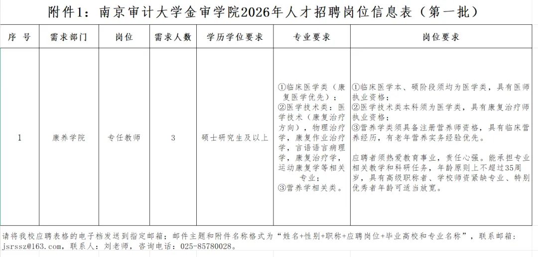 2、报名方式:应聘人员填写《南京审计大学金审学院招聘报名表》(见附件2),并将报名表格通过附件以word格式发送至联系邮箱。邮件主题和附件名称格式规范统一写成“姓名+性别+职称+应聘岗位+毕业高校和专业名称”,联系邮箱: jsrssz@163.com,联系人:刘老师,联系电话:025-85780028。