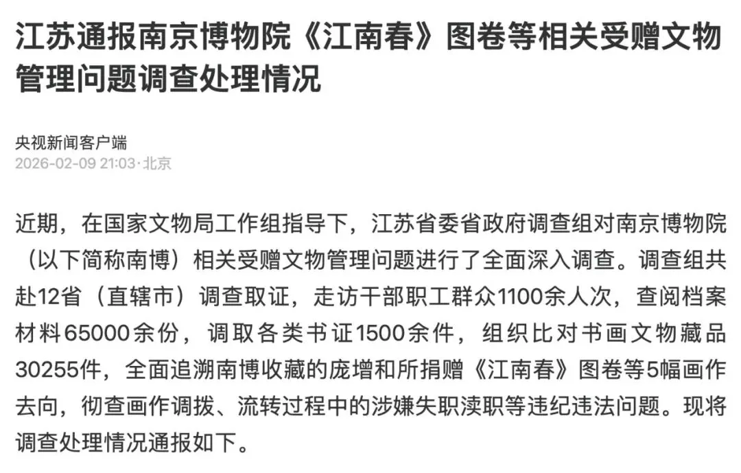 这场规模空前的调查揭示了令人震惊的真相:在《江南春》图卷等画作调拨、流转过程中,原省文化厅、南京博物院和原省文物总店共同违反了文物管理有关规定。