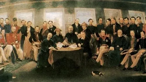 8月17日,道光皇帝批回的“上谕”说:考虑到江南地区数百万百姓,一经打仗,生命难保;既然耆英、伊里布等大臣已答应英国所请各条,我也只能以民命为重了。话说得很婉转,但意思是明白的,就是同意耆英他们彻底投降。接着,他又批回同意《南京条约>各条。8月29日《南京条约》正式签字了。英国人为了增添签字仪式的隆重性,把他们所有少校以上的军官都召来参加。清方代表耆英、牛鉴等一大批官员都到场,伊里布本来已病倒,这时也抱病出席。