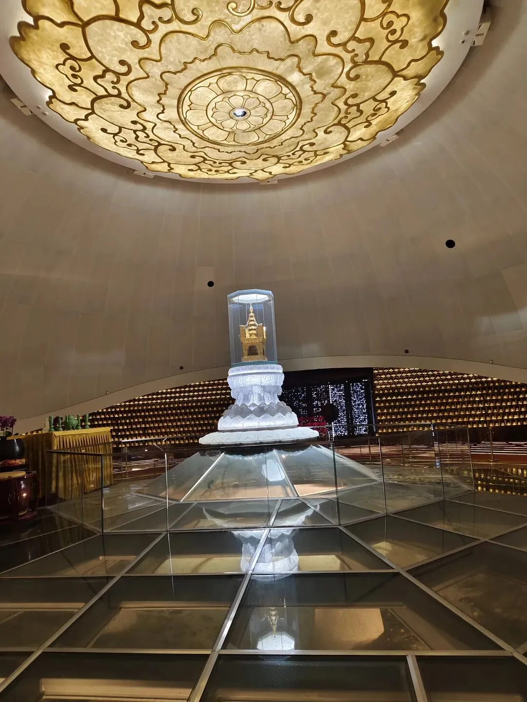 巨大的塔座内,穹顶金碧辉煌,穹顶下供奉着鎏金阿育王塔。
