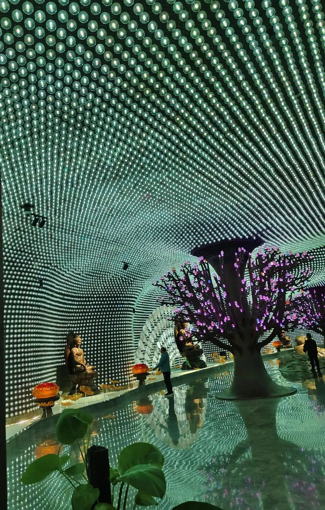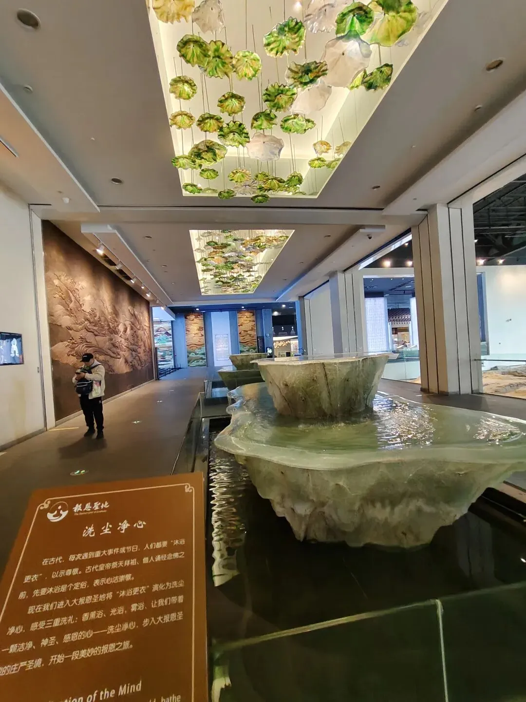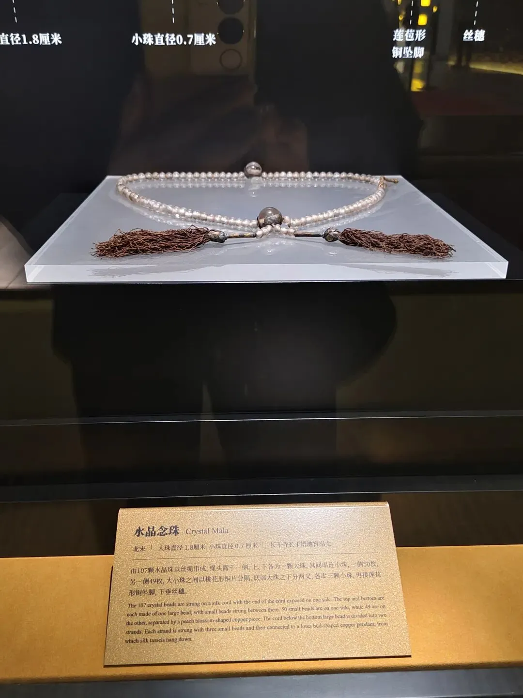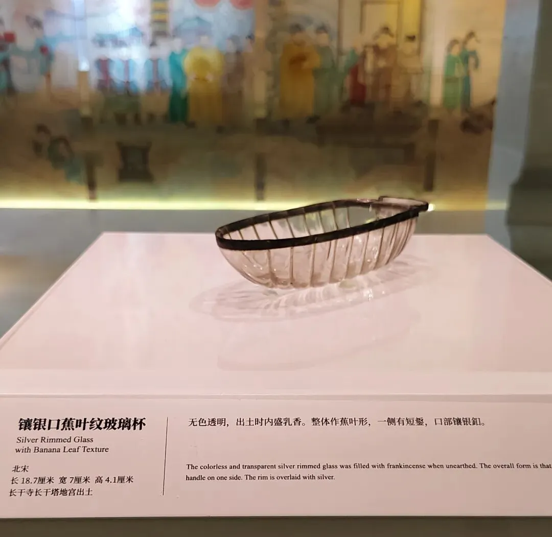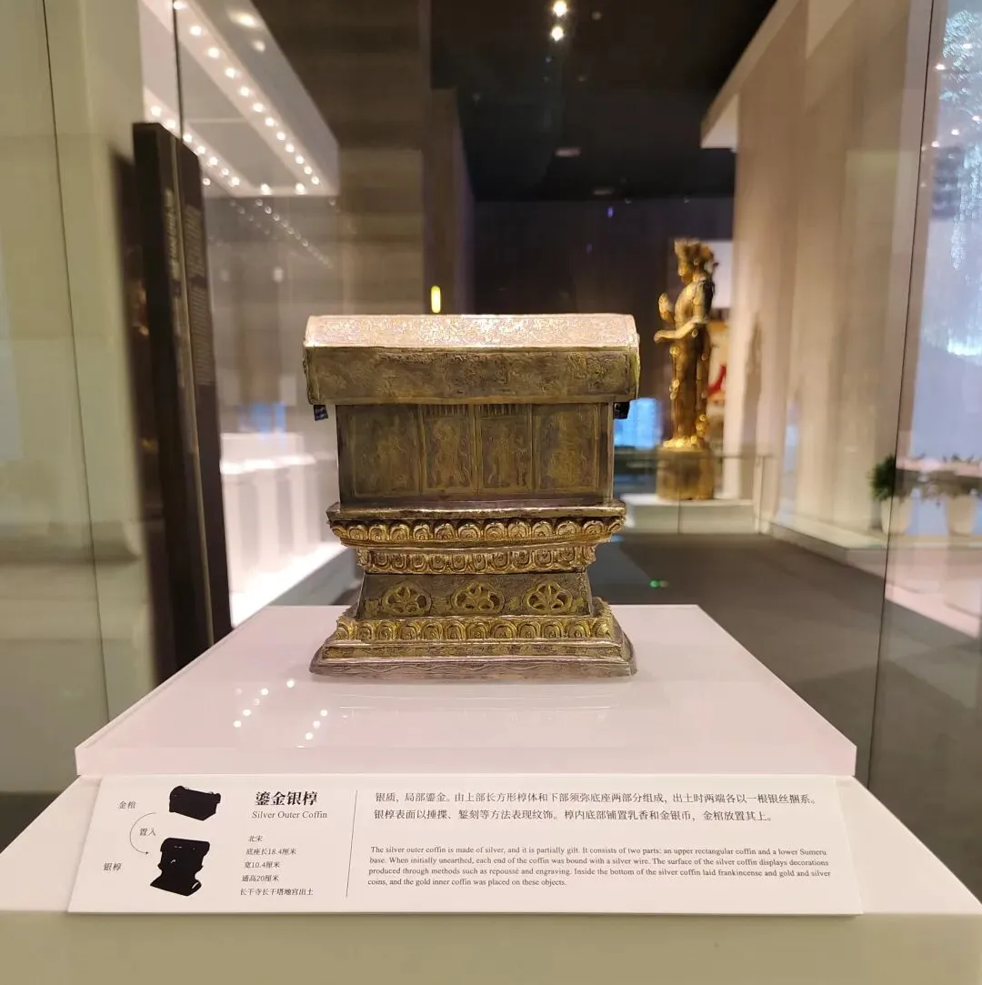 以玻璃塔为中心,在塔的外围建了一大圈现代风格的展厅。展厅里保存着多处寺庙遗址。 还展出许多文物。这就是上文所述2008年出土的北宋时期地宫里珍藏舍利的鎏金银椁。外饰精美华丽。 这是地宫里出土的一串水晶念珠和镶银口 蕉叶纹 玻璃杯。 展厅里供奉着许多佛像。进门有“洗尘净心”处,洗手净心,然后步入圣境。