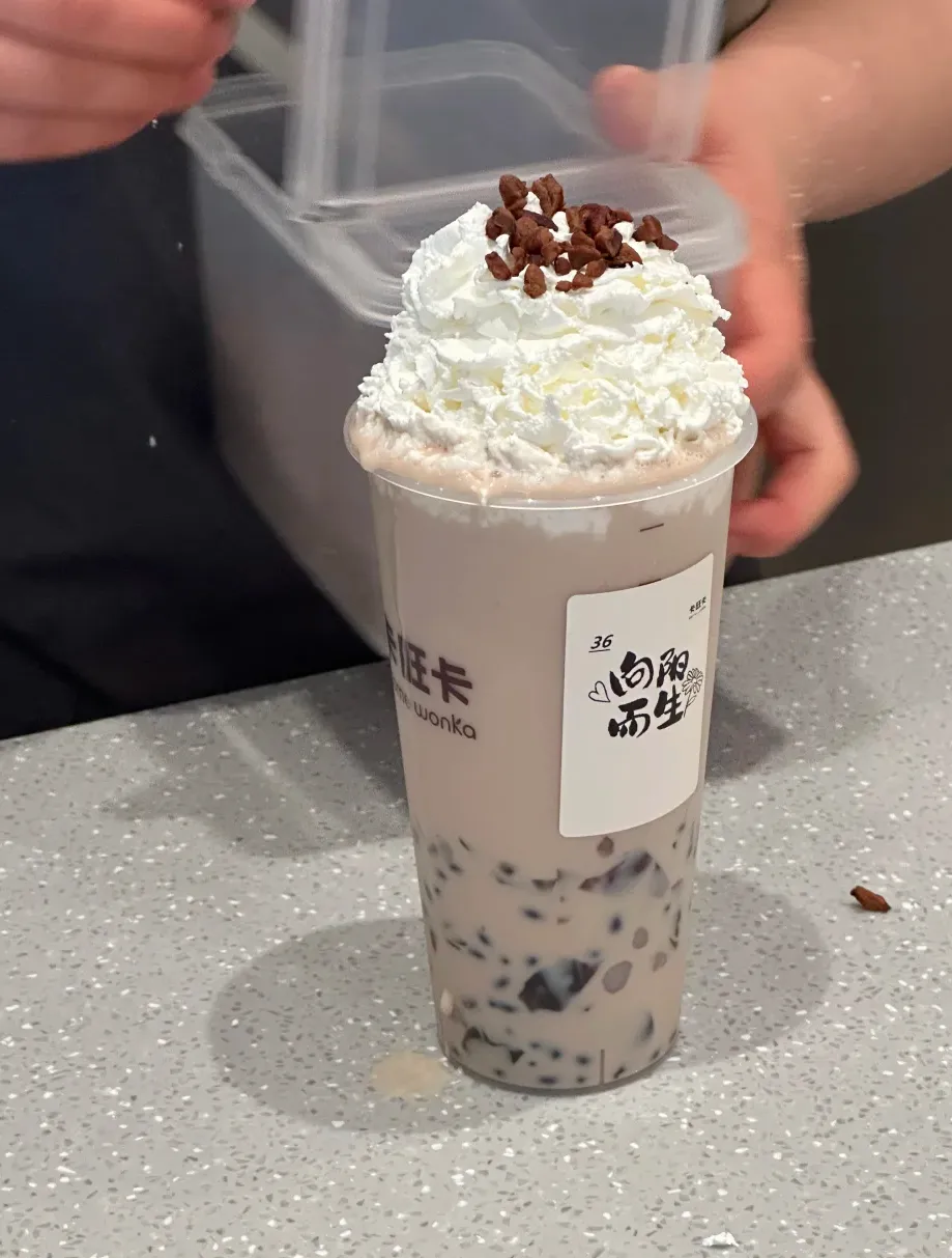 黑全套奶茶,卡旺卡的经典代表作,以红茶为基底,融入黑米、黑糖布丁和碧根果碎,口感层次如山水层层叠叠。