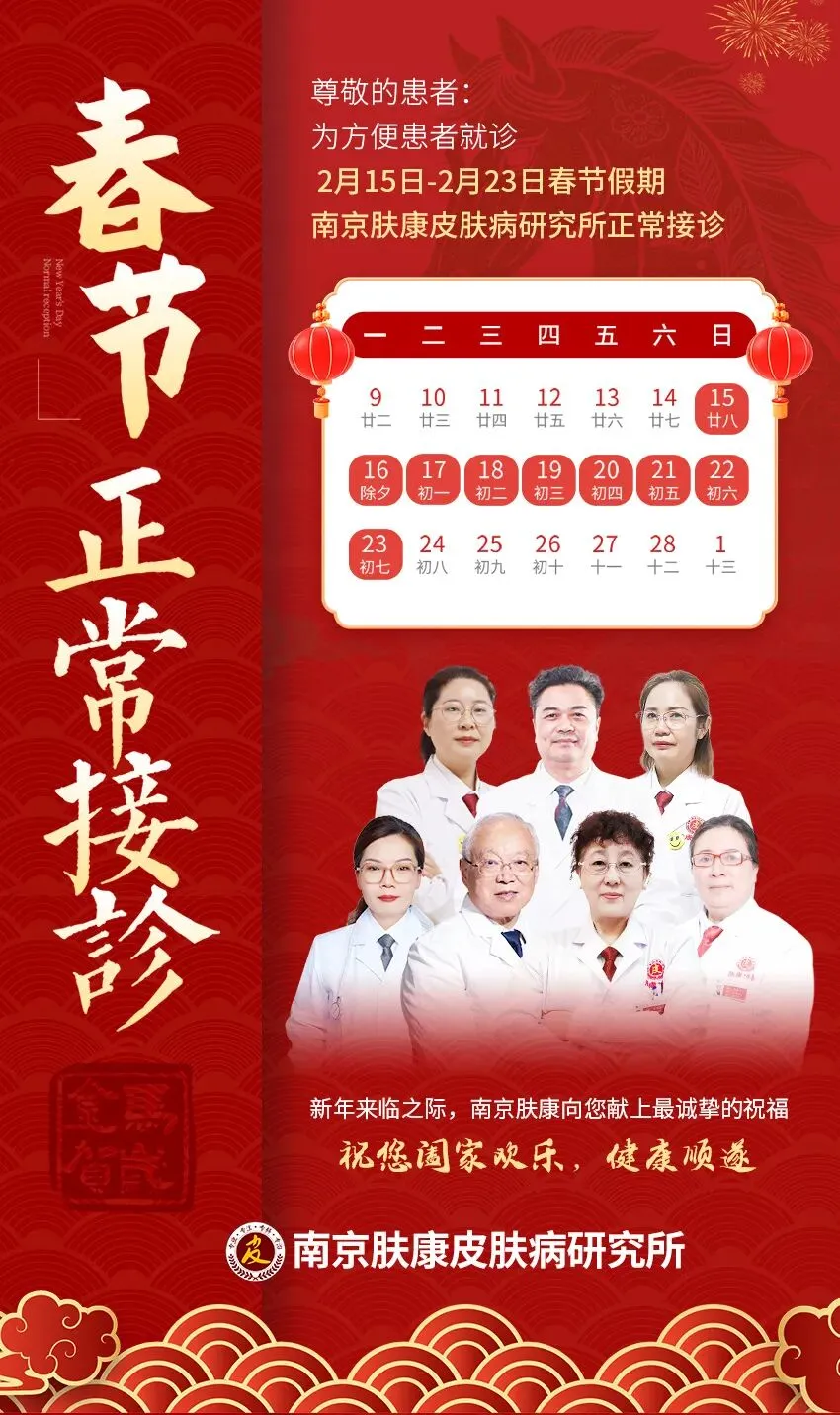 新春守护,肤康同行!南京肤康皮肤病研究所全体医护人员将坚守岗位,以专业的诊疗技术、贴心的服务态度,为你和家人的皮肤健康保驾护航。愿你新春团圆美满,肌肤无恙,舒心过大年!