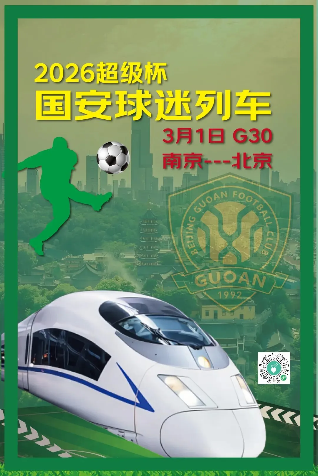 超级杯比赛正值春运及开学期间,为了保证国安球迷观赛,铁路部门通过加开编组,增大运力,并考虑到比赛可能有加时、颁奖等环节,开通了3月1日南京南20:02-23:21回北京G30国安球迷观赛列车,现国安球迷可于2月10日12点至2月14日每天12点扫码购票报名,2月14日报名结束将无法退票退款,此报名费用包括高铁票和南京奥体中心前往南京南大巴车,不含观赛球票。希望国安球迷想好再报名,每日收款额度有限,不要报完名就取消,浪费每日有限名额。
