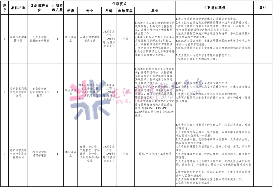 3.集团所属南京城市更新产业投资发展有限公司招商运营部招商管理岗1名。