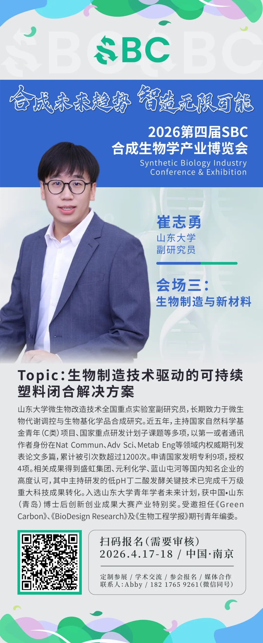 山东大学副研究员崔志勇先生将出席本次大会,并在“会场三:生物制造与新材料”作主题报告:生物制造技术驱动的可持续塑料闭合解决方案;应对塑料污染与气候变化双重危机,崔志勇先生团队提出“生物基/再生基闭合循环”创新方案,通过合成生物学与绿色生物制造重塑塑料价值链。生物基塑料单体绿色制造方面,首创耐酸微生物细胞工厂(pH<3.0),实现丁二酸、3-羟基丙酸等可降解塑料单体高效合成,并开发“低pH发酵-分离”一体化工艺,彻底消除石膏固废,分离成本降低60%以上;废弃塑料高值循环方面,基于AI智能酶设计开发全球领先的聚酯降解酶LCC-A2,3.3小时降解>90%消费后PET(瓶/膜/纤维),适应200g/L高浓度工业环境,进一步通过合成生物学将降解产物升级为生物聚酯PHA、粘康酸等高附加值化合物。该成套技术方案成功构筑了“从生物基单体到再生基材料”的完整塑料生命周期闭环,是可持续的塑料解决方案,展现出颠覆传统石化基路径的巨大潜力。