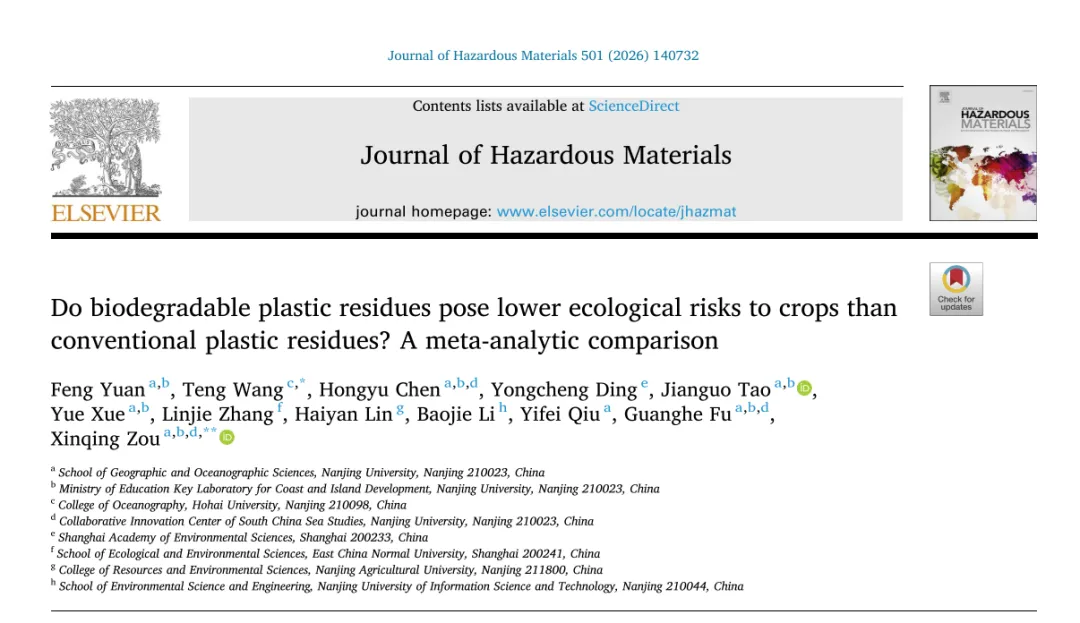 •标题:Do biodegradable plastic residues pose lower ecological risks to crops than conventional plastic residues? A meta-analytic comparison