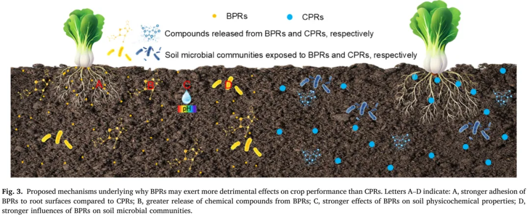 研究结论:BPRs对作物的生态风险不亚于甚至高于CPRs,尤其在高浓度、酸性及低有机质土壤中。但由于现有研究暴露时间短、依赖 virgin 塑料、缺乏田间数据,暂无法完全确定二者风险差异。
