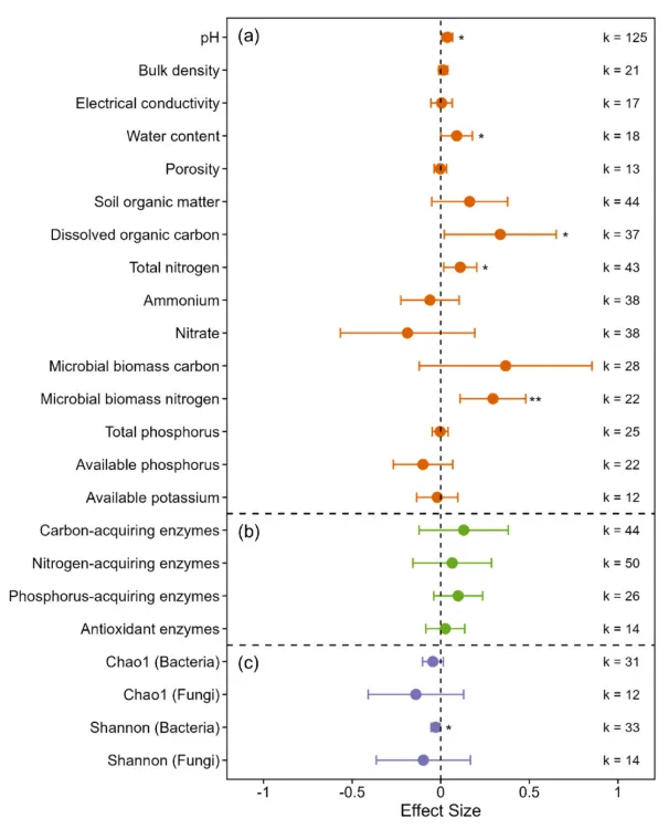 含其他污染物(如重金属)的研究,依据《土壤环境质量农用地土壤污染风险管控标准》(GB15618-2018)判断:浓度低于风险阈值者纳入,否则排除。未报土壤有机质(SOM)但有土壤有机碳(SOC)时,按SOC÷0.58估算SOM。同时提取暴露后土壤理化性质、酶活性和微生物α多样性数据,用于环境动态评估。