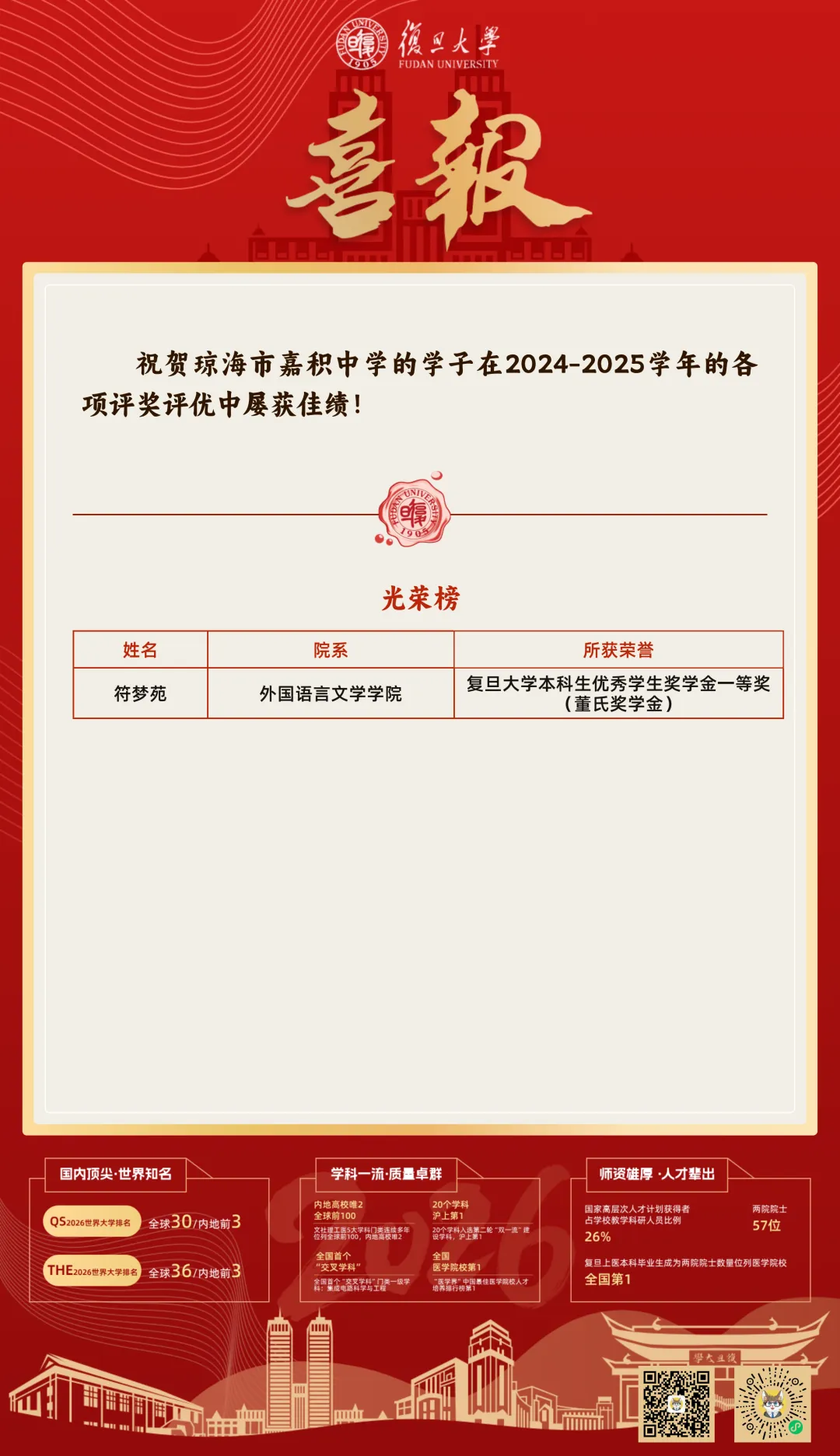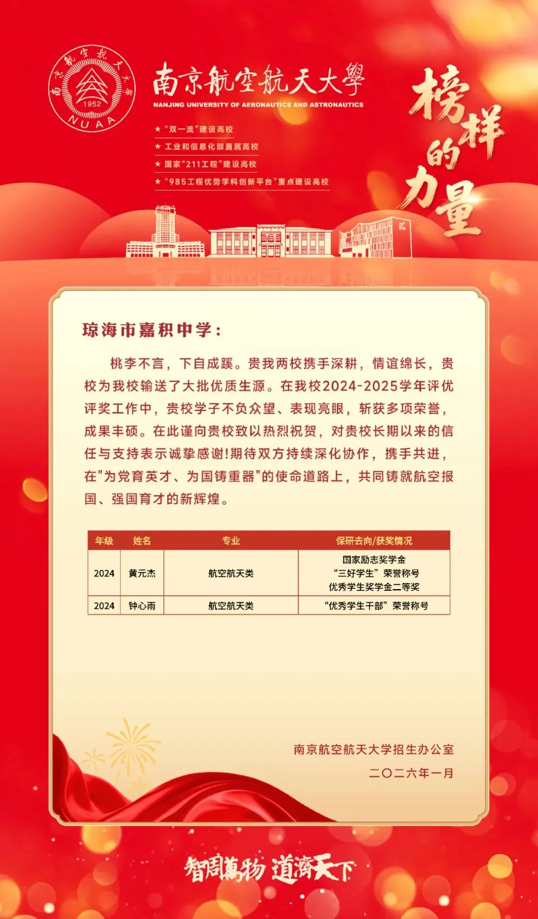 复旦大学、南京航空航天大学等知名大学向我校发来喜报