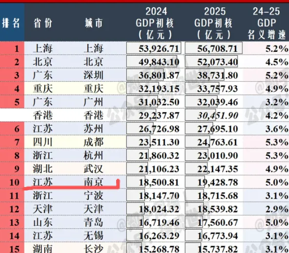 在已经公布的2025年全国GDP数据来看,南京依然稳居第十,名义增速仅次于上海、深圳、成都和杭州。南哥之所以暂时成为不了南哥,是前面一直有苏州压着。苏州是一个老牌工业之城,以制造业和外贸为主的最强地级市,大量的工厂贡献了绝大部分的GDP,而南京是科教之城,以科教、服务业、和省会总部经济为主,工业产值面对苏州不占优势,所以南京急需弯道超车,力争在第4次工业革命期间超越苏州。虽然从GDP增速来看南京跑得快一点,但因为苏州的基数太大,快接近3万亿,苏州涨3.6%带来的增量,其实比南京涨5%带来的增量还要多, 假设通过增速来计算: