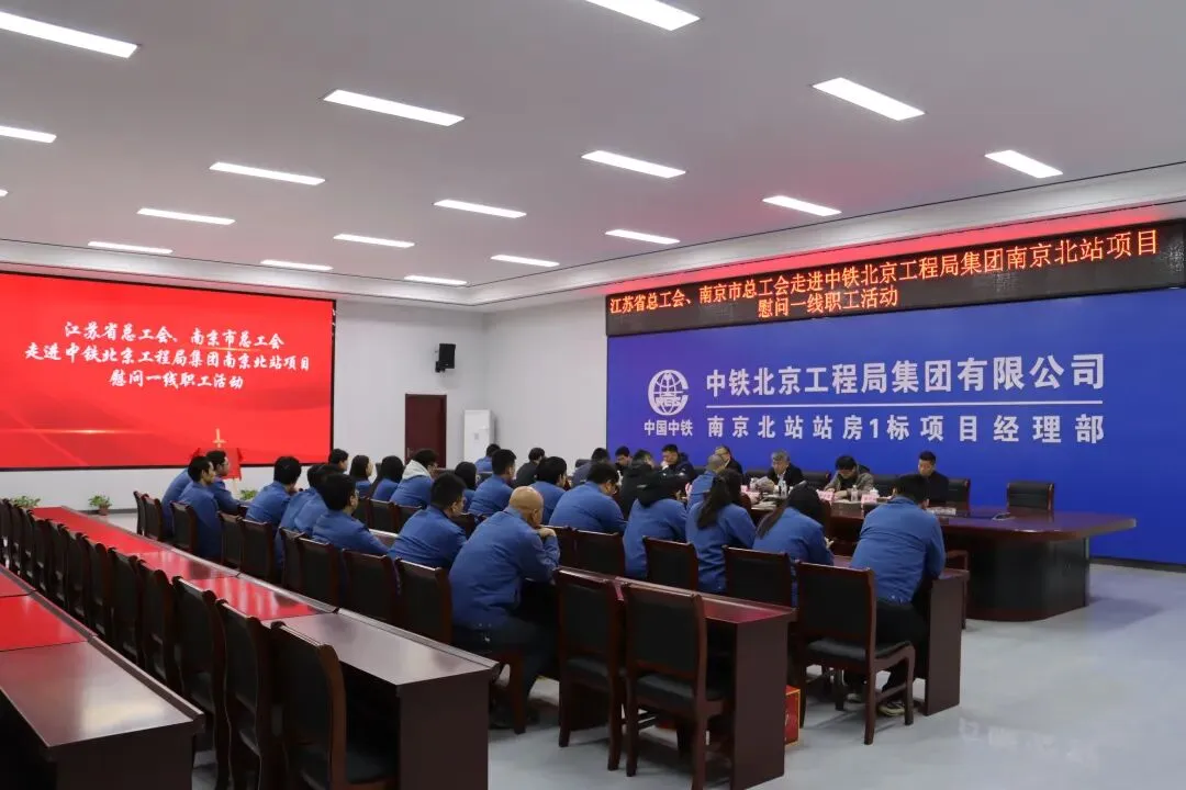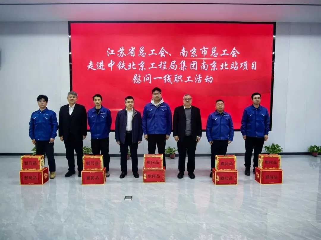 2月5日,江苏省总工会副主席、党组成员、一级巡视员王树华,南京市总工会党组书记、副主席焦勇一行赴中铁北京局南京北站项目开展劳模创新工作室揭牌仪式及慰问活动。