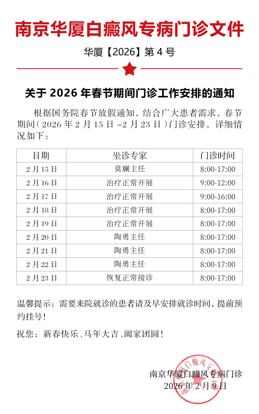 关于春节期间南京华厦白癜风门诊开放诊疗服务的通知(官方发布)