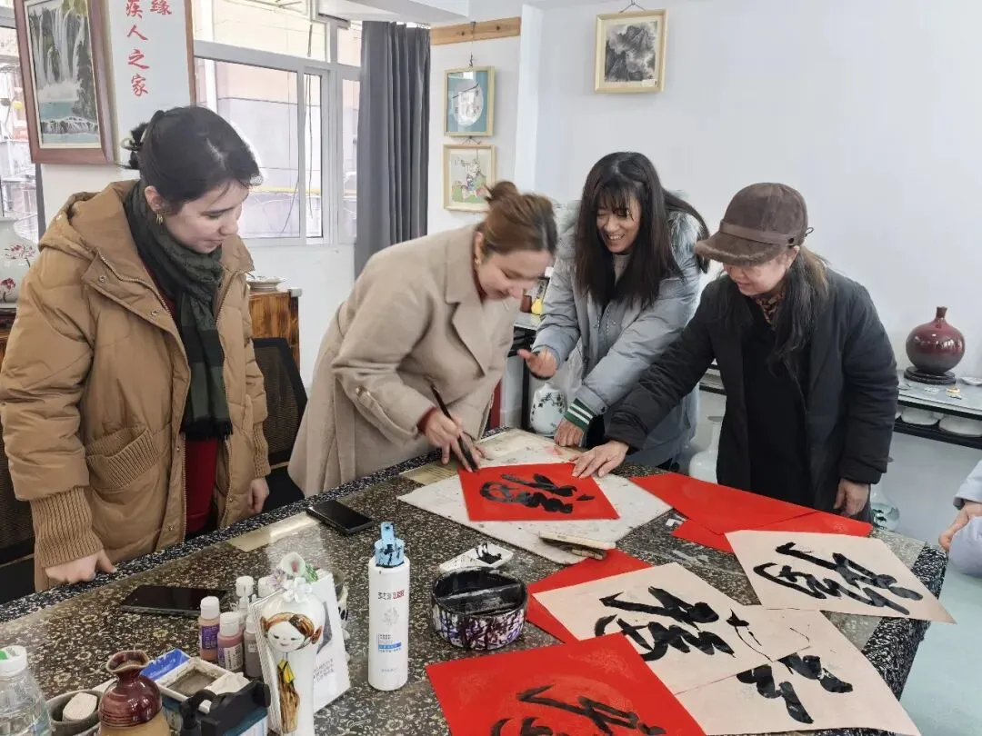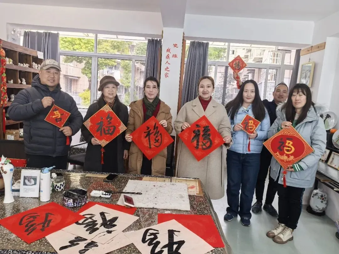 活动中,随行的外国友人也深度参与到新春民俗体验中,和学员们一起写福字,感受中国传统年俗文化。学员们不仅向外国朋友赠送了亲手书写的福字与对联,还送上了精心制作的十二生肖手工作品,以独具心意的文创礼物传递新春祝福,让中外文化在温馨互动中交融共鸣。收到这份特别的礼物,外国友人爱不释手、连连称赞,脸上洋溢着开心的笑容。大家围坐交流、携手互动,机构工作人员也向志愿者、老师和外国友人详细介绍了瓷缘残疾人之家的服务项目与日常开展的特色活动,让更多人了解、关注助残公益事业。