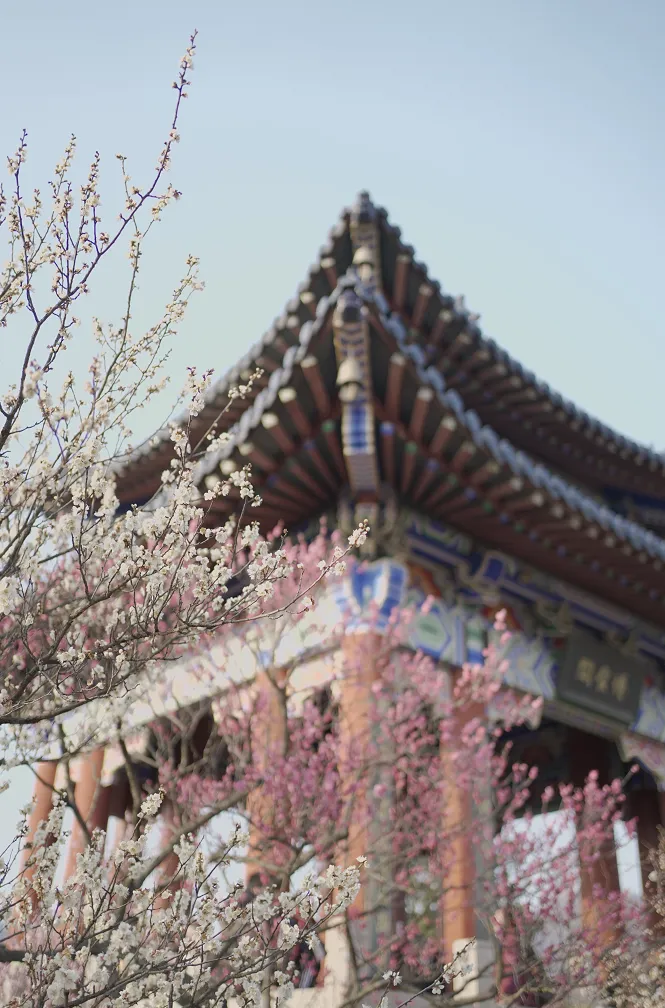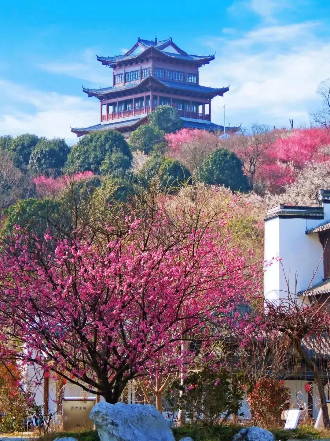 山顶最高处的赏梅阁,可以俯瞰整座梅花山,梅若烟霞,云蒸霞蔚,红梅如锦似霞,白梅高洁素雅,绿萼梅清绝孤傲,玉蝶梅幽香环绕……红的、白的、粉的,交织成一幅醉人的油画。