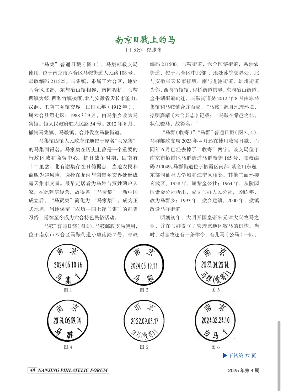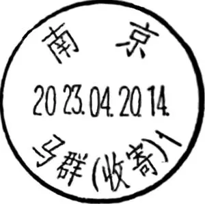 “马群(收寄)”“马群”普通日戳(图3、4),马群邮政支局2023年4月还在使用收寄日戳,而同年6月已经去掉了“收寄”两字。该支局位于南京市栖霞区马群街道马群新街165号,邮政编码210049。马群街道位于南京市栖霞区南部,紫金山东麓,东部与仙林大学城和江宁区相邻,其他三面环接玄武区。1958年,属紫金公社;1964年,从陵园区紫金公社析出,成立马群人民公社;1983年,改为马群乡;1993年,撤乡建镇。2000年,撤镇改设马群街道。