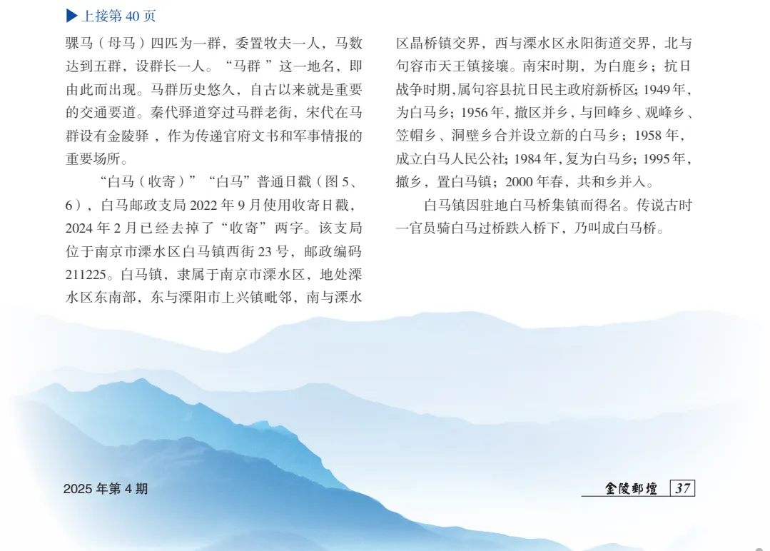 “白马(收寄)”“白马”普通日戳(图5、6),白马邮政支局2022年9月使用收寄日戳,2024年2月已经去掉了“收寄”两字。该支局位于南京市溧水区白马镇西街23号,邮政编码211225。白马镇,隶属于南京市溧水区,地处溧水区东南部,东与溧阳市上兴镇毗邻,南与溧水区晶桥镇交界,西与溧水区永阳街道交界,北与句容市天王镇接壤。南宋时期,为白鹿乡;抗日战争时期,属句容县抗日民主政府新桥区;1949年,为白马乡;1956年,撤区并乡,与回峰乡、观峰乡、笠帽乡、洞壁乡合并设立新的白马乡;1958年,成立白马人民公社;1984年,复为白马乡;1995年,撤乡,置白马镇;2000年春,共和乡并入。白马镇因驻地白马桥集镇而得名。传说古时一官员骑白马过桥跌入桥下,乃叫成白马桥。