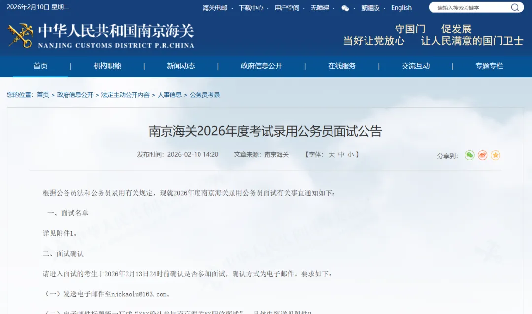 根据公务员法和公务员录用有关规定,现就2026年度南京海关录用公务员面试有关事宜通知如下: