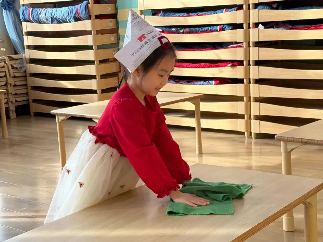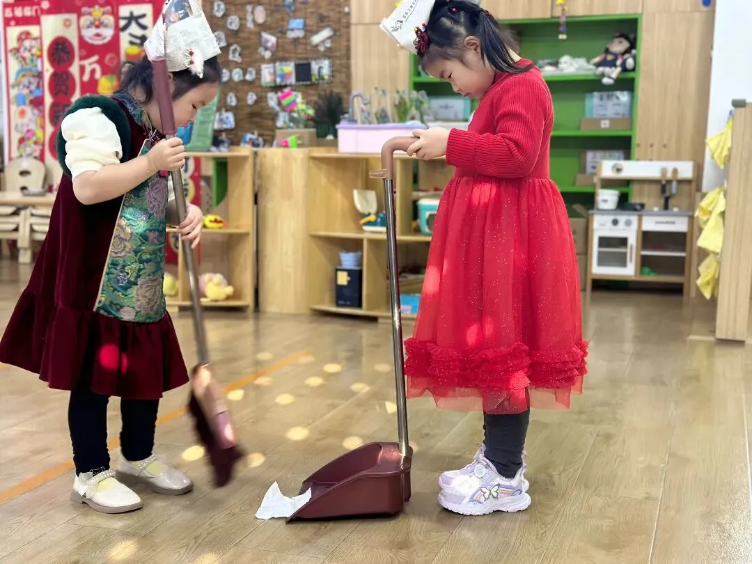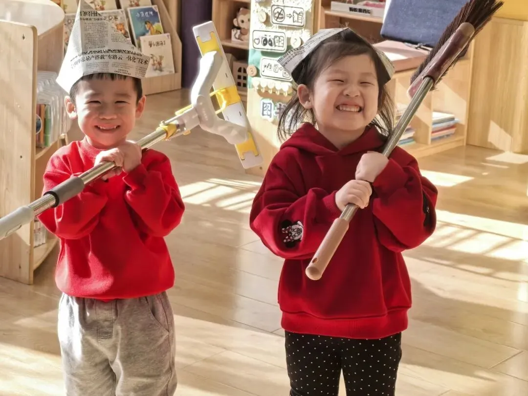 宝贝们化身“除尘小卫士”,拿起小扫帚、小抹布认真扫尘,用童真的方式,把“灰尘”统统扫出门,迎接干干净净的新年。