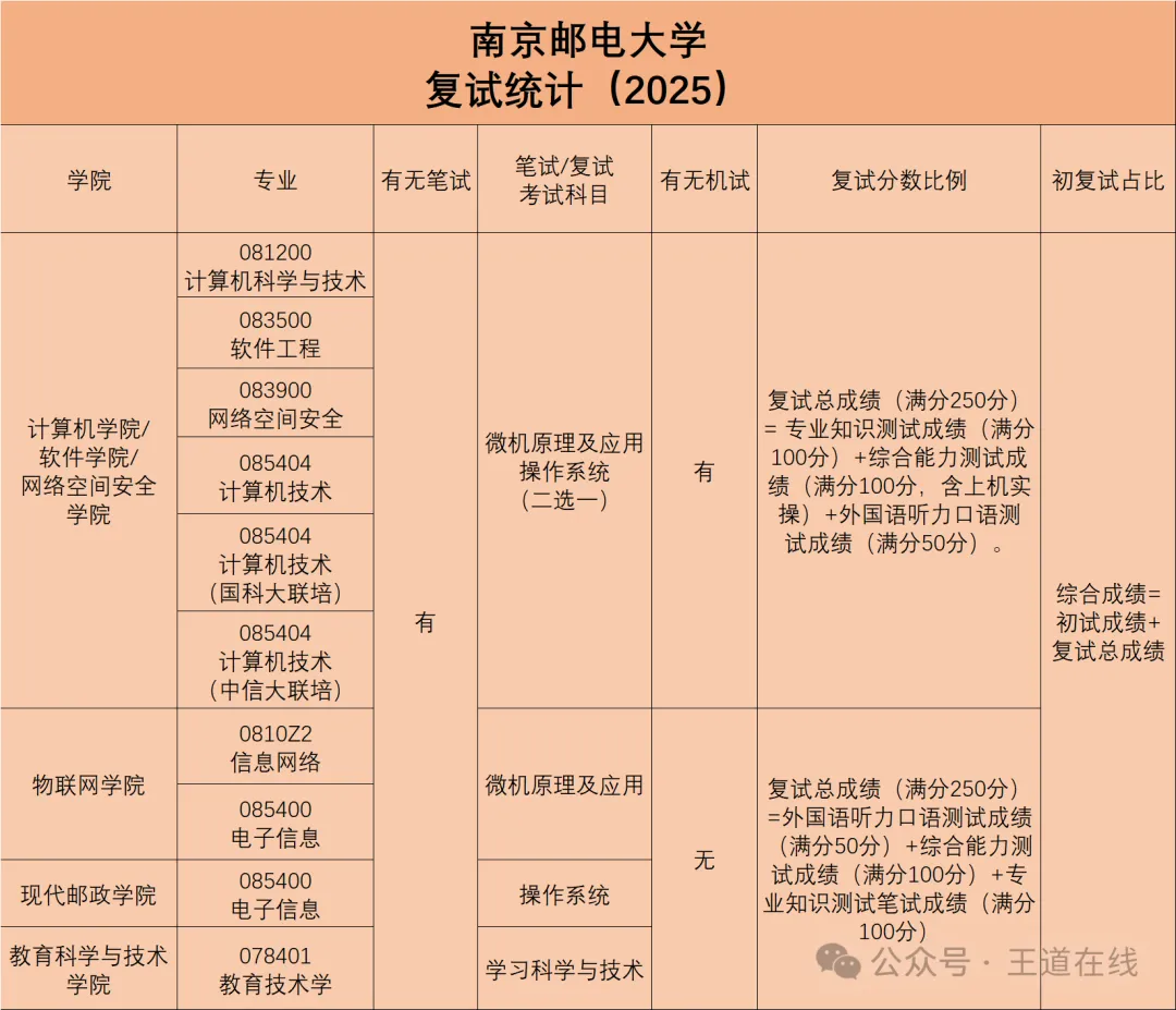 本次复试采用现场线下复试方式。凡是达到第一志愿复试分数线,均有复试资格。复试包括专业知识测试(笔试)、外国语听力口 语测试、综合能力测试(上机实操)和综合能力测试(综合面试)。其中专业知识测试时间为2小时,综合能力测试(上机实操)测试时间为65分钟,外国语听力口语测试和综合能力测试(综合面试)同场进行,合计不少于20分钟/考生。 专业知识测试采用笔试的形式,时间为2025年3月28日(星期五)下午,具体安排请参见下表说明。 2. 外国语听力口语测试和综合能力测试(满分150分) 外国语听力口语测试和综合能力测试时间为3月28日至3月30日,分专业同时进行,具体安排请参见下表说明。其中,外国语听力口语测试采用面试形式,满分为50分;综合能力测试包含上机实操(25分)+综合面试(75分)两部分,两部分考试分别进复试成绩组成及流程 复试总成绩(满分250分)=专业知识测试成绩(满分100分)+综合能力测试成绩(满分100分,含上机实操)+外国语听力口语测试成绩(满分50分)。 专业知识测试,成绩满分为100分,笔试时间120分钟; 综合能力测试,成绩满分为100分(其中①“综合能力测试-上机实操现场编程”满分25分;②“综合能力测试-面试”满分75分); (综合能力测试-面试部分、外国语听力口语测试两项均采用面试形式,合并在同场面试中进行,每考生面试时间建议不少于20分钟)。本次复试采用现场复试方式。凡是达到第一志愿复试分数线,均有复试资格。复试包括专业知识测试(笔试)、外国语听力口语测试和综合能力测试(面试),其中专业知识测试时间不低于2小时,外国语听力口语测试和综合能力测试时间合计不少于20分钟。2.外国语听力口语测试和综合能力测试(满分150分)在复试工作中,我院将思想政治素质、道德品质及诚实守信情况考核作为重要环节。在复试过程中作弊或违纪者将取消复试资格;提供虚假材料,弄虚作假者一经查实随时取消复试资格、录取资格、学籍,并通报考生单位。1.坚持“择优录取、宁缺毋滥”的原则,按照招生计划和复试录取实施细则进行录取。2.录取成绩要求:按考生综合成绩从高到低依次录取,同样分数以初试成绩高者优先录取;初试成绩也相同者,初试数学成绩高者优先录取。计算公式为:复试总成绩(满分250分)=外国语听力口语测试成绩(满分50分)+综合能力测试成绩(满分100分)+专业知识测试成绩(满分100分)。外国语听力口语测试成绩低于30分或综合能力测试成绩低于60分,即为不合格,不予录取。本次复试采用线下复试方式。凡是达到第一志愿复试分数线,均有复试资格。复试包括专业知识测试(笔试)、外国语听力口语测试和综合能力测试(面试),其中专业知识测试时间:电子信息、交通运输专业2小时,物流工程与管理专业3小时(思想政治理论笔试1小时,专业课笔试2小时)。外国语听力口语测试和综合能力测试时间合计不少于20分钟。 1.进入复试考生名单,将于2025年3月21日在学院网站公布。 专业知识测试采用笔试的形式,时间为3月28日(星期五)。所有面试地点均在三牌楼校区,具体面试安排将于3月28日在行政北楼布告栏公布。 复试流程及注意事项请见《现代邮政学院2025年硕士研究生复试须知》。 4.复试包括专业知识测试笔试(100分)、综合能力测试(100分)和外国语听力口语测试(50分),合计250分。 在复试工作中,我院将思想政治素质、道德品质及诚实守信情况考核作为重要环节。在复试过程中作弊或违纪者将取消复试资格;提供虚假材料,弄虚作假者一经查实随时取消复试资格、录取资格、学籍,并通报考生单位。 1.坚持“择优录取、宁缺毋滥”的原则,按照招生计划和复试录取实施细则进行录取。 2.录取成绩要求:按照考生的报考专业(电子信息、交通运输、物流工程与管理),严格按考生综合成绩的排名,从高分到低分依次确定拟录取名单,同样分数以初试成绩高者优先录取;初试成绩也相同者,专业知识测试笔试成绩高者优先录取。 计算公式为:复试总成绩(满分250分)=外国语听力口语测试成绩(满分50分)+综合能力测试成绩(满分100分)+专业知识测试笔试成绩(满分100分)。(物流工程与管理专业知识测试笔试包括思想政治理论笔试以及专业课笔试,满分均为100分。思想政治理论笔试成绩以及专业课笔试成绩分别以30%,70%比例折算计入专业知识测试笔试成绩。) 物流工程与管理专业总成绩=初试成绩+复试成绩*60%。 综合能力测试成绩小于60分的考生不予录取;外国语听力口语能力测试成绩小于30分的考生不予录取;思想政治素质和道德品质考核不合格者,不予录取。 3.推免生不参加此次复试,须参加后期师生互选环节。 4.学院确定拟录取名单后交研究生院审核,拟录取名单审核通过后在学校研招网公示不少于7日。本次复试采用现场复试方式。凡是达到第一志愿复试分数线,均有复试资格。复试包括专业知识测试(笔试)、外国语听力口语测试和综合能力测试(面试),其中专业知识测试时间不低于2小时,外国语听力口语测试和综合能力测试时间合计不少于20分钟。专业知识测试采用笔试的形式,时间为3月26日(星期三)。注意事项:考生须持初试准考证、居民身份证进入考场参加考试。 2. 外国语听力口语测试和综合能力测试(满分150分) 外国语听力口语测试和综合能力测试时间为3月26日(星期三)12:00开始分专业同时进行。在复试工作中,我院将思想政治