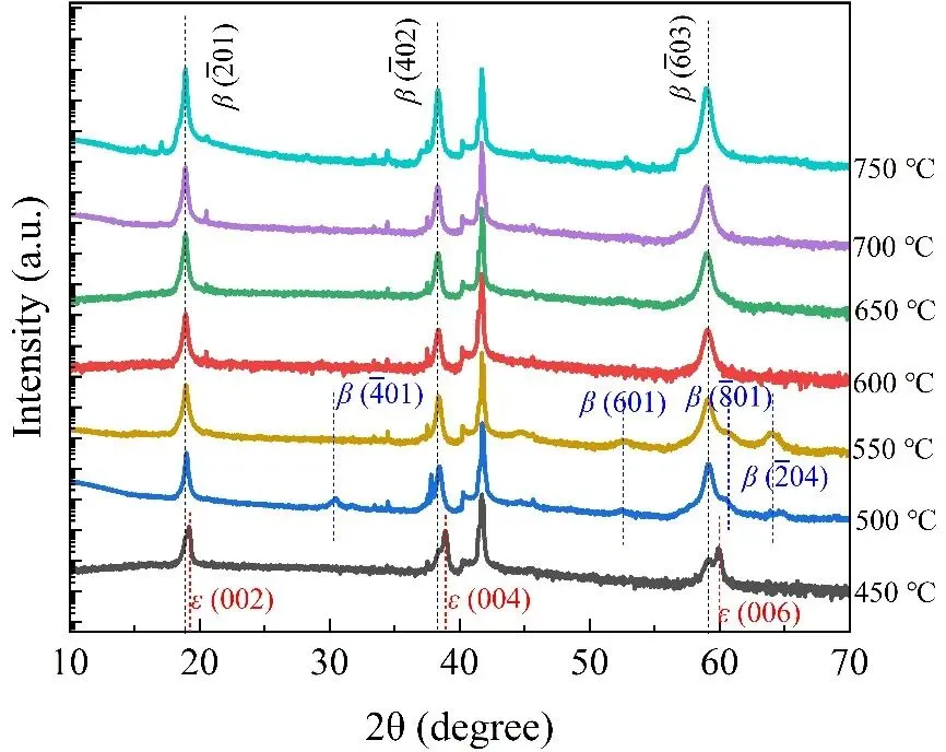 ● 明确了MOCVD生长中 β-Ga2O3 的成核与相变行为。当生长温度超过 600°C 时,可获得单一取向(-201)的高质量 β 相薄膜,且结晶度随温度升高而持续改善。通过综合评估晶体质量、表面粗糙度、生长速率及氧空位浓度,确定最优生长温度。