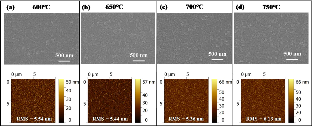 图2 不同温度下生长的 β-Ga2O3 薄膜的SEM及AFM表面形貌图像:(a) 600°C, (b) 650°C, (c) 700°C, (d) 750°C。