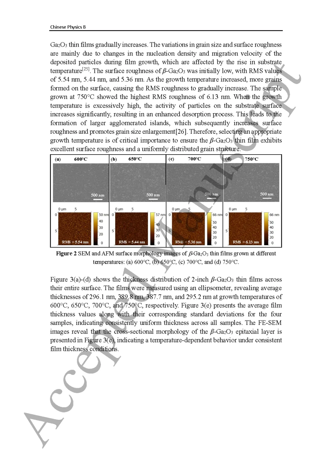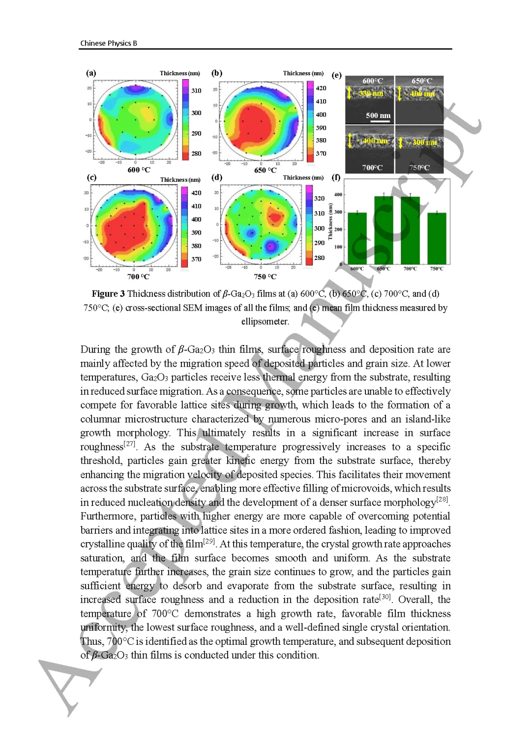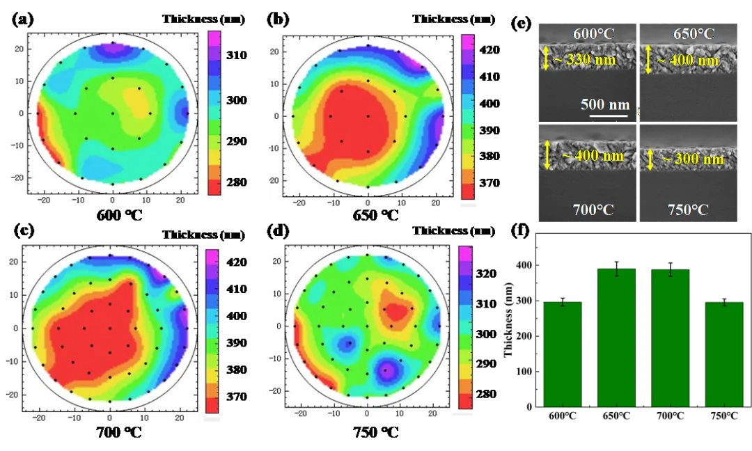 图3 β-Ga2O3薄膜在不同温度下的厚度分布:(a) 600℃, (b) 650℃, (c) 700℃, (d) 750℃;(e)所有薄膜的截面SEM图像及(f)其椭圆偏振仪测量的平均膜厚。