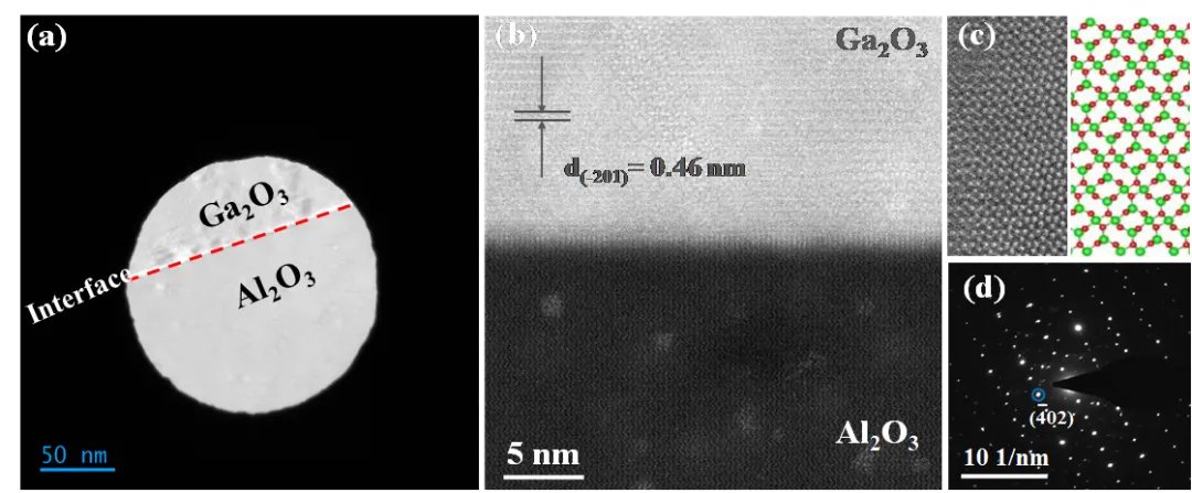 图4 700℃下生长的 β-Ga2O3 薄膜的TEM截面图像:(a)低倍像,(b)高分辨TEM像,(c)放大HAADF像,(d)选区电子衍射花样。