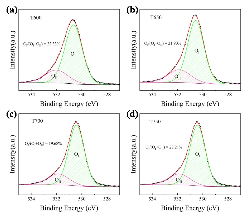 图5 β-Ga2O3薄膜的分峰拟合O 1s高分辨率XPS谱图及对应的OII/(OI + OII)组分比例:(a) T600, (b) T650, (c) T700, (d) T750。