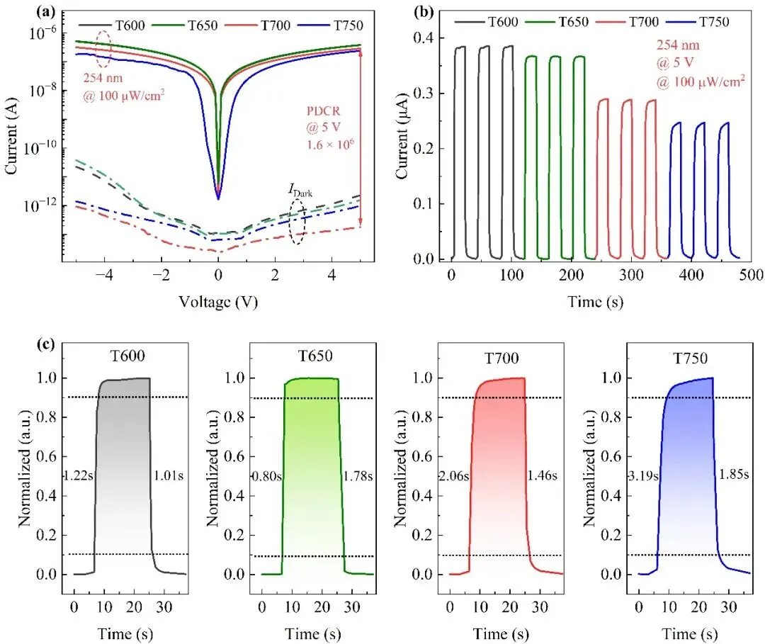 图6 T600、T650、T700和T750光电探测器在5 V偏压、254 nm波长、100 μW/cm2光照强度下的(a)电流-电压特性曲线,(b)随时间变化的光响应特性,以及(c)上升与衰减时间对应的归一化电流-时间曲线。