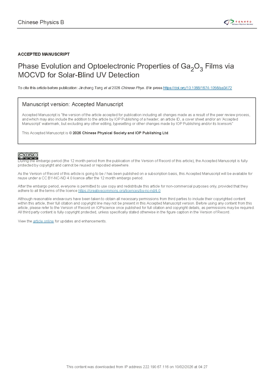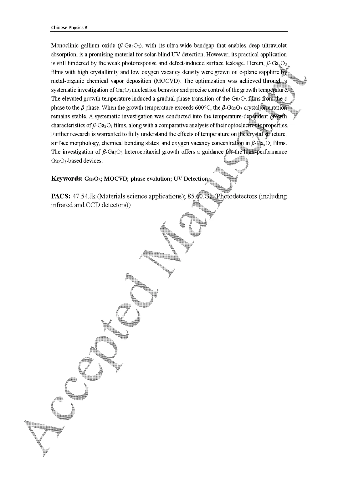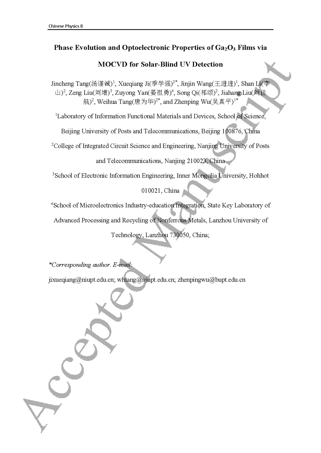 由北京邮电大学吴真平教授联合南京邮电大学唐为华教授团队的研究团队在学术期刊 Chinese Physics B 发布了一篇名为 Phase Evolution and Optoelectronic Properties of Ga2O3 Films via MOCVD for Solar-Blind UV Detection(面向日盲紫外探测的 MOCVD 法制备 Ga2O3 薄膜:相演化与光电性能)的文章。