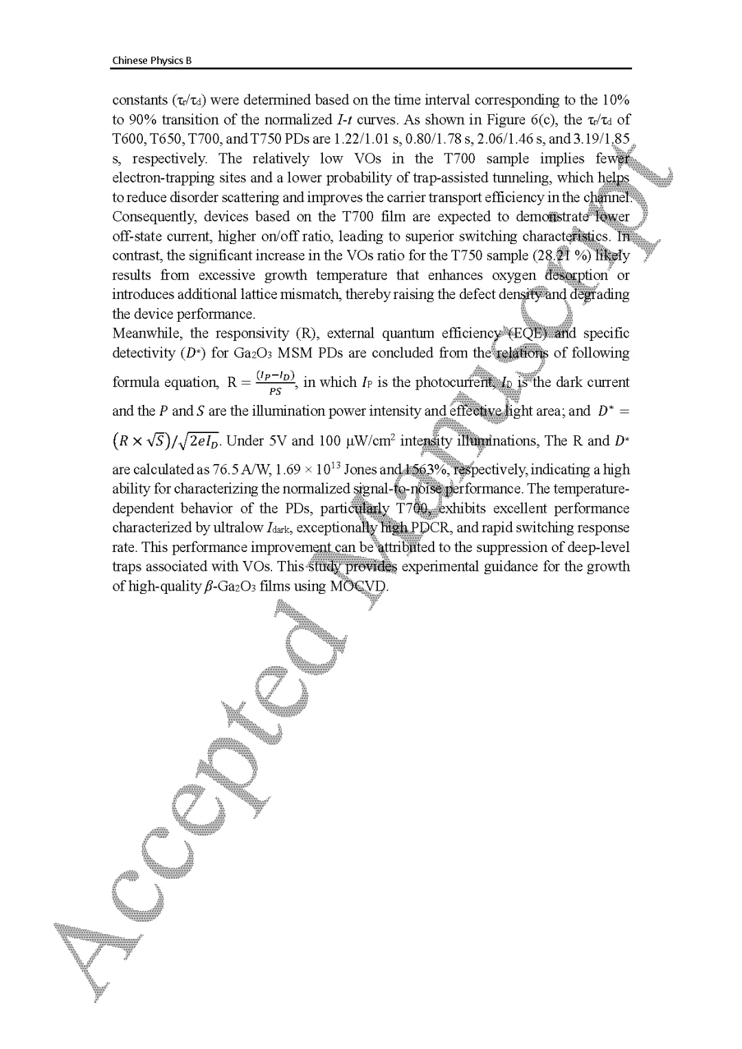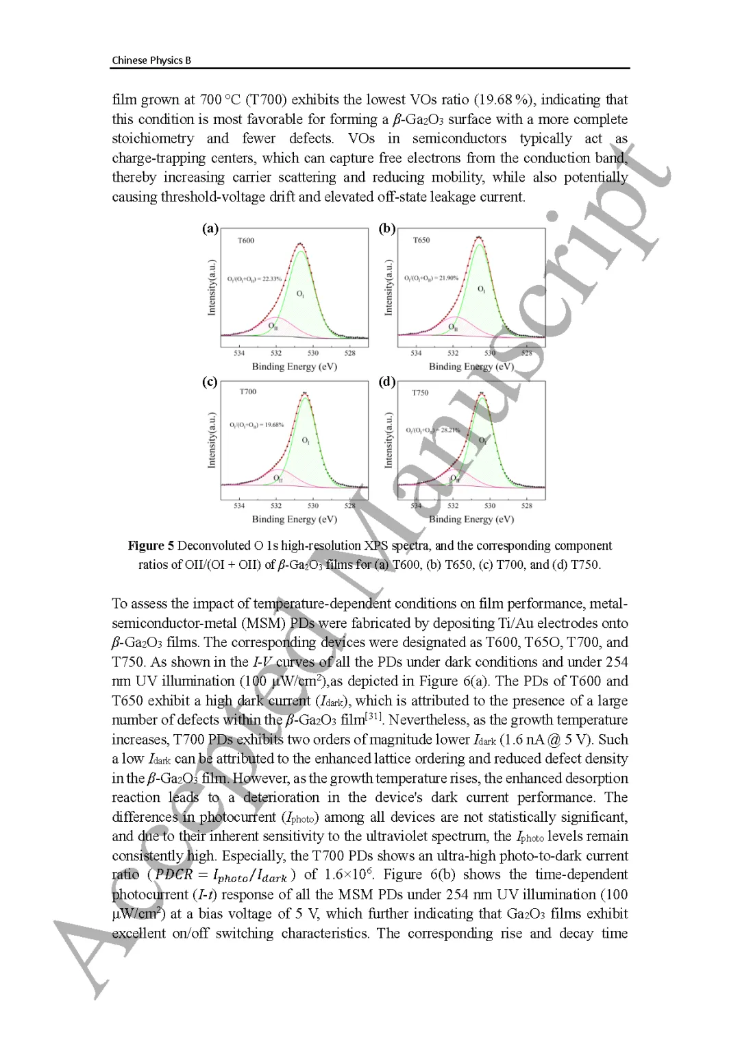 ● 阐明了生长温度通过影响氧空位浓度,进而调控探测器性能的物理机制。较低的氧空位缺陷抑制了载流子陷阱辅助隧穿与散射,是 T700 器件获得高性能的关键。