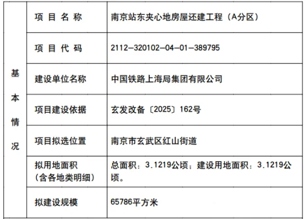 据用地预审与选址意见书显示,项目总面积3.1219公顷,拟建设规模65786平方米,建设单位名称为中国铁路上海局集团有限公司,项目建设依据为玄发改备〔2025〕162号。