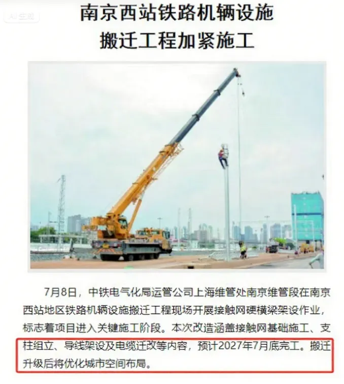 此前,据官媒消息:南京西站地区铁路机辆设施搬迁工程,预计2027年7月底完工,比去年官宣的2025年完工,又要延期2年了,这必将延误南京西站的搬迁。