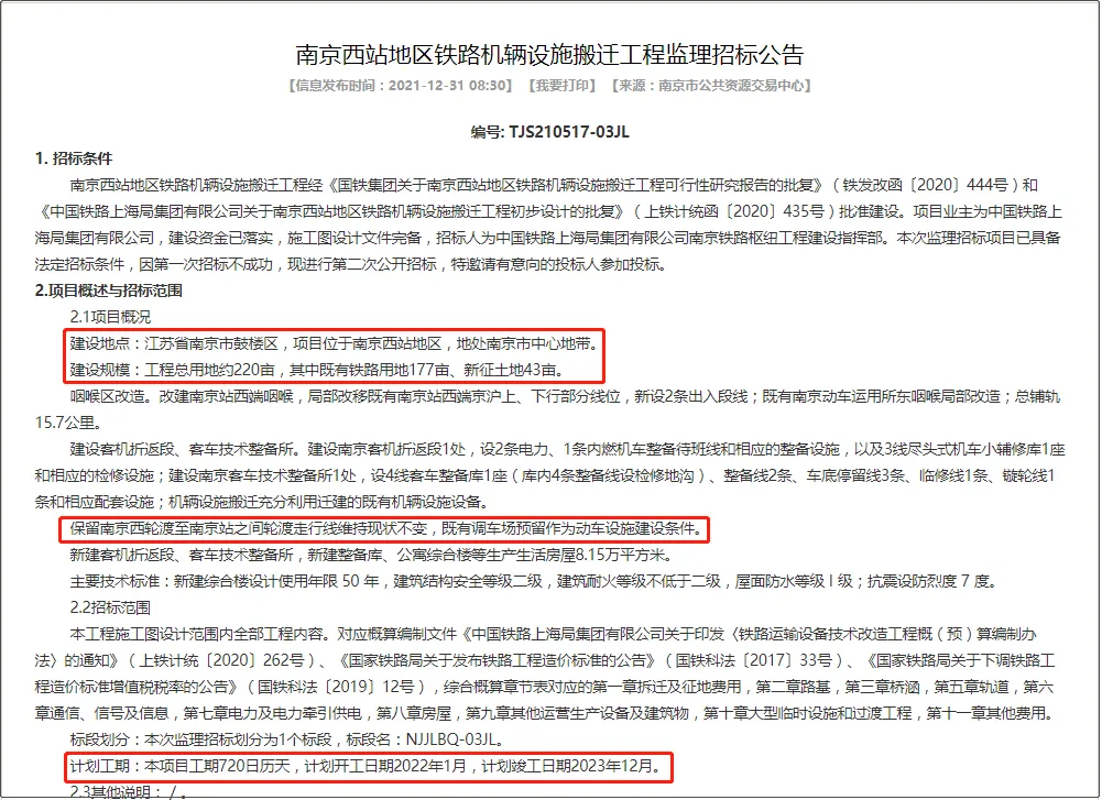 2021年,中铁上海工程局还中标了铁路机辆设施搬迁工程施工总价的承包,当时招标公告显示南京西站地区铁路机辆设施班前工程施工,计划2022年1月开工,2023年12月竣工。
