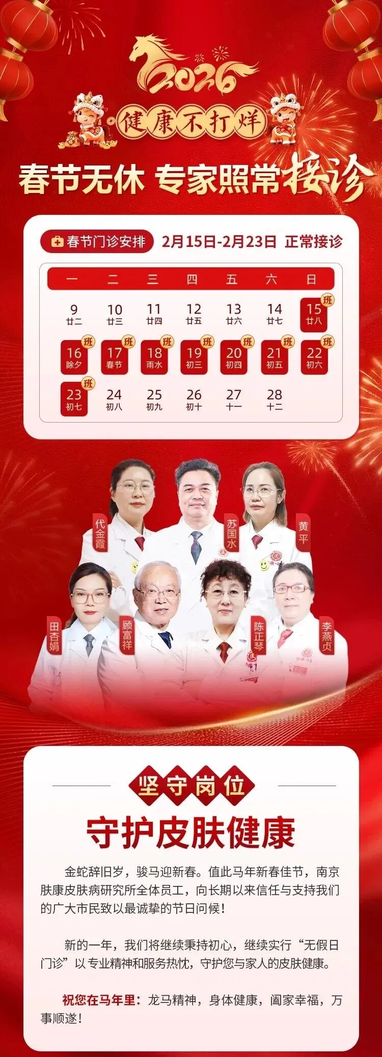 马年新春将至,为守护市民皮肤健康,南京肤康皮肤病研究所春节不打烊,2月9日-2月15日(春节假期)正常坐诊,资深专家轮班值守,让您就医、过节两不耽误✨