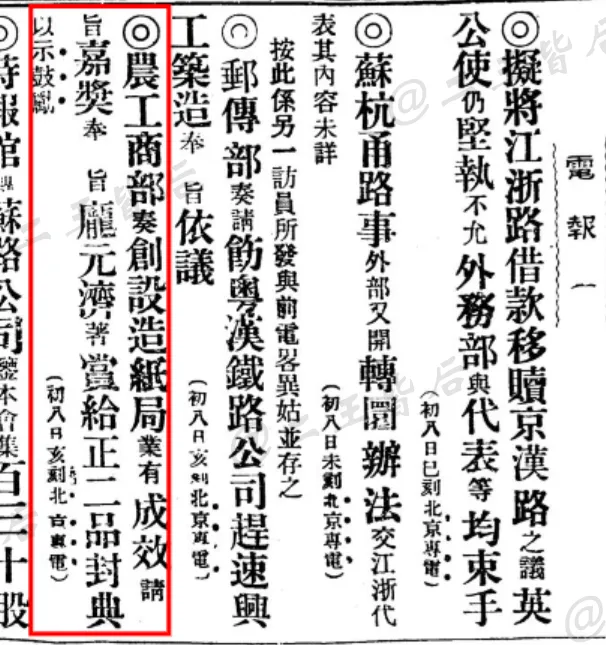 1905年,农工商部指派时为候补京堂的庞元济承办并总理上海机械造纸有限公司。3年后,他由此被授正二品封典。
