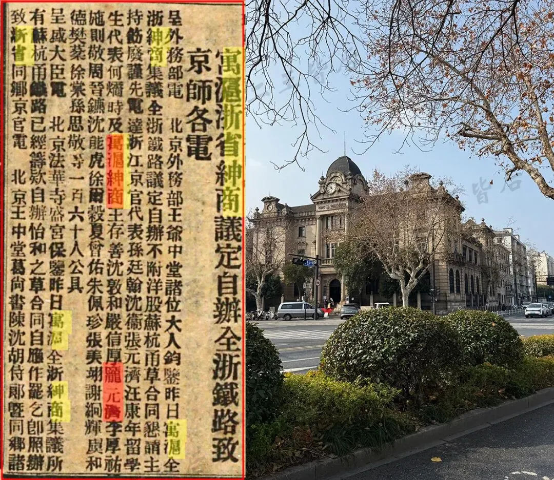 除了以上这些实业,网上很多文章提到庞元济还创办了浙江铁路公司和浙江兴业银行。1905年7月,在沪浙商商讨自办全浙铁路,成立浙江全省铁路公司。为存放股款,在1907年又附设铁路银行——这就是如今中山中路民国婚纱照热门取景地——浙江兴业银行旧址。
