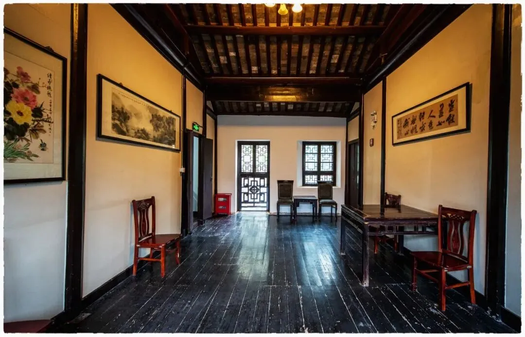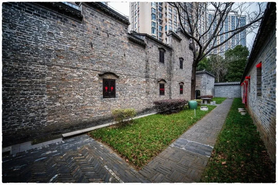 后院的回廊连接着偏房,墙上嵌着记录故居修缮历程的碑刻,清水勾缝的围墙巧妙地遮挡了后方的现代高楼,让整个院落始终沉浸在古朴的氛围里。后院的小花园里种着几株翠竹与月季,绿意盎然,坐在回廊的石凳上休息片刻,听听风吹树叶的声音,感受着院落的静谧,浮躁的心也会慢慢沉静下来。如果同行有老人或小孩,院内的石板路较为平整,行走方便,无需担心不便。